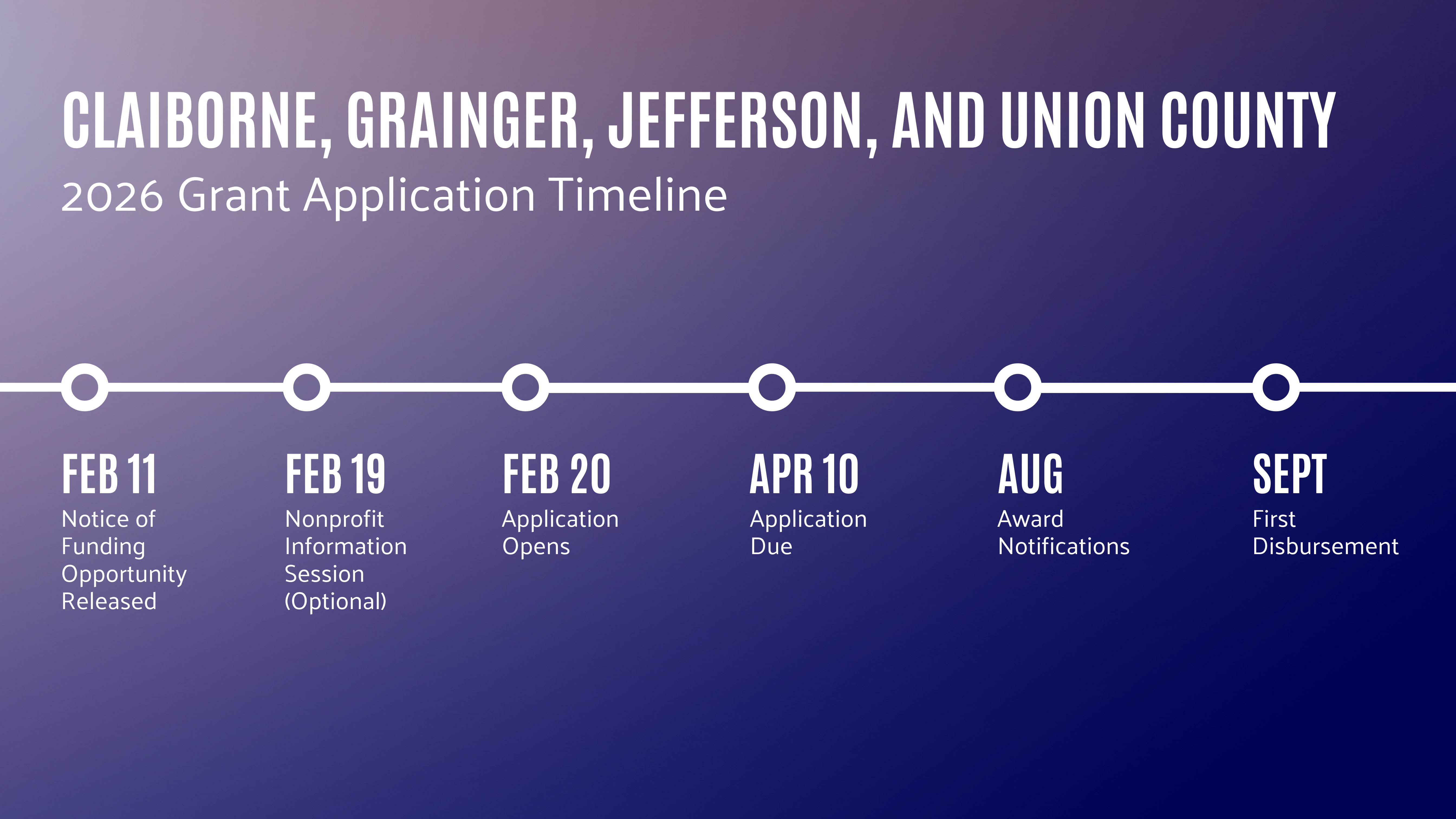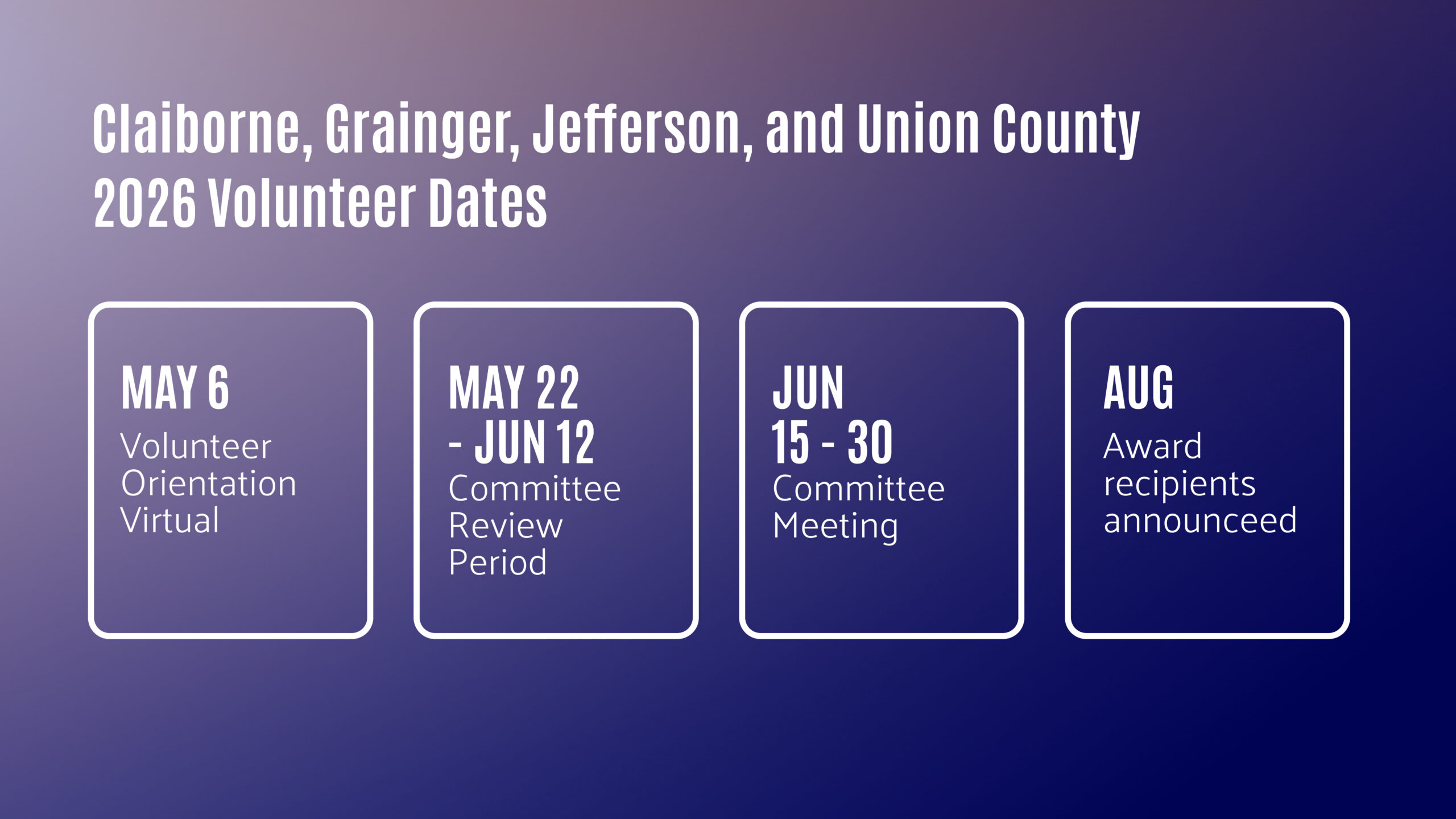 All applications are reviewed by volunteer review panels and our Outcomes Based Investment Committee, a standing committee and part of our Governance structure. For organizations serving outside of Knox County, these applications will be reviewed by a volunteer review panel comprised of residents and community members from Claiborne, Grainger, Jefferson, and Union counties who understand the needs of their communitiesfirsthand.