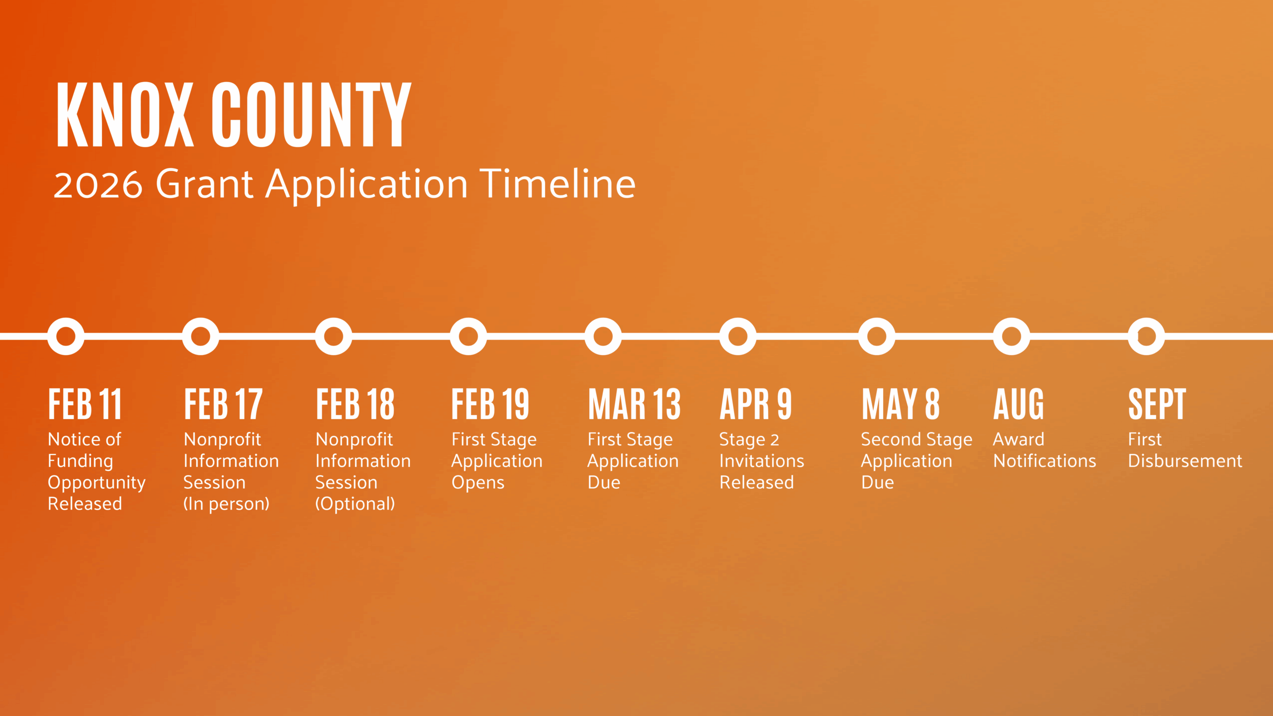 All organizations with a presence in Knox County should apply through the Knox County-specific process, including additional counties (if any) they are serving. For organizations serving Claiborne, Grainger, Jefferson, or Union Counties without service in Knox County, apply through the Counties Process.