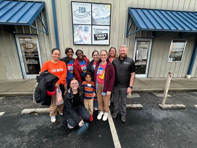The UWGK team gives their time together at FISH Hospitality Pantries for a team day of service.